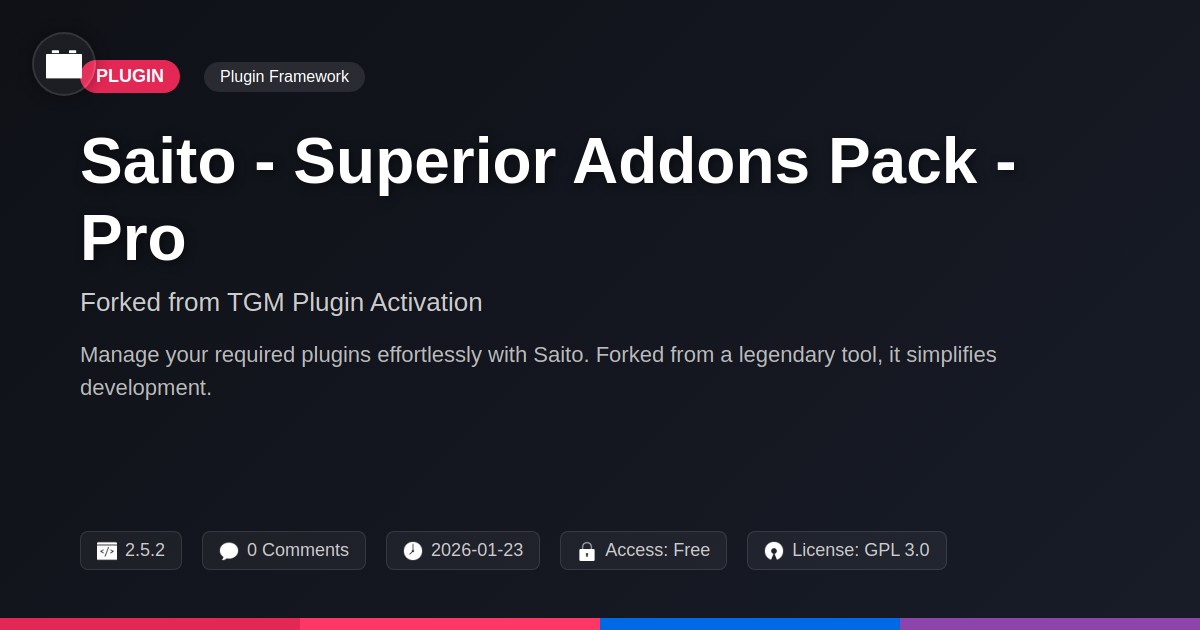 This is where Saito - Superior Addons Pack - Pro swoops in, not with a cape, but with a sophisticated, developer-centric toolkit. Forked from the legendary TGM Plugin Activation by Festinger Vault, we've taken a proven, battle-tested system and injected it with a generous dose of modern enhancements and a sprinkle of developer-friendly magic. Think of it as your personal plugin concierge, ensuring your site's ecosystem is always healthy, happy, and operational. No more frantic emails to clients about missing plugins, no more broken sites because plugin-x decided to go rogue. We’re here to bring order to the plugin chaos, allowing you to focus on what you do best: building awesome websites.