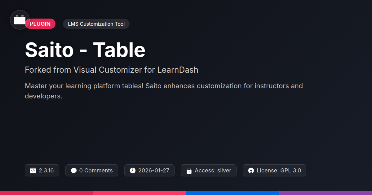 So, you’ve survived the deep dive into Saito - Table, the digital equivalent of finding a secret cheat code for your learning site’s aesthetics. We’ve poked fun at the doldrums of generic design, marveled at the sheer control this thing offers, and high-fived the open-source community for making it all possible. You’re probably itching to ditch those bland templates and craft something that doesn’t just teach but actually inspires. Whether you’re a code-slinging wizard, an agency aiming to dazzle, or just someone who appreciates a well-oiled, customizable machine, Saito - Table is designed to be your co-pilot. It’s not about adding another plugin; it’s about unlocking potential. It’s about transforming a functional learning system into an unforgettable experience. Remember the pain of rigid structures and the yearning for true creative freedom? Saito - Table answers that call with a resounding, “Yes, you can!” Don’t let your valuable content get lost in a sea of sameness. It’s time to stop admiring the problem and start building the solution. Your learners – and your clients – will thank you for it. Now go forth and customize like you’ve always wanted to.