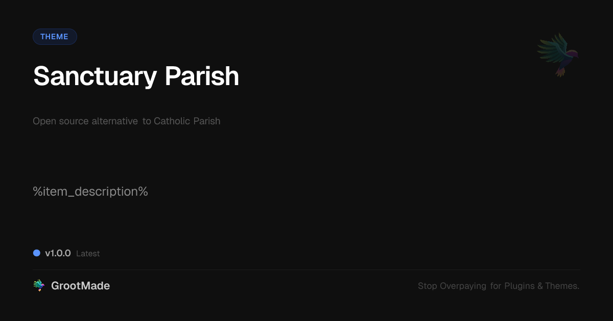 GrootMade is NOT affiliated with Catholic Parish or its original author. Catholic Parish™ is a trademark of its respective owner and use of it does not imply any endorsement or affiliation. This product has been forked under the GNU General Public License (GPL) and all non-GPL assets (such as proprietary images, fonts, and branding) have been removed. Distributing GPL-licensed code is 100% legal.