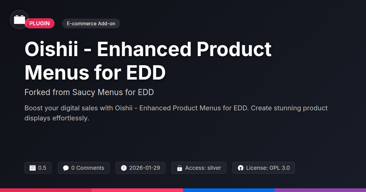 So, there you have it. If you’ve been slogging through the digital doldrums, forcing your exquisite digital creations onto unsuspecting visitors via menus that scream 'I gave up,' it’s time for a palate cleanser. Oishii – Enhanced Product Menus for EDD isn't just a fancy name; it's a promise. A promise of better presentation, happier customers, and frankly, a slightly less soul-crushing experience for you, the creators and maintainers of the web's digital backbone. We’ve taken a solid foundation, respected its legacy, and infused it with the kind of vibrant energy and practical enhancements that make using it feel less like a chore and more like, well, a delight. Whether you’re a solo developer polishing your own offerings, an agency crafting stunning client experiences, or a die-hard open-source advocate who appreciates elegantly built tools, Oishii offers something genuinely valuable. It’s about making your digital products look as good as they perform, turning browsing into an enticing journey rather than a tedious checklist. Don't let mediocre menus sabotage your sales or your sanity. It's time to upgrade your display, embrace better design, and offer your customers a truly 'delicious' experience. Because when your products look this good, they’re practically begging to be bought. Now go forth and make your digital storefront the envy of the internet (or at least, a lot less depressing).