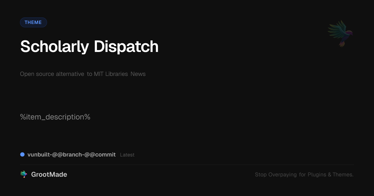 GrootMade is NOT affiliated with MIT Libraries News or its original author. MIT Libraries News™ is a trademark of its respective owner and use of it does not imply any endorsement or affiliation. This product has been forked under the GNU General Public License (GPL) and all non-GPL assets (such as proprietary images, fonts, and branding) have been removed. Distributing GPL-licensed code is 100% legal.