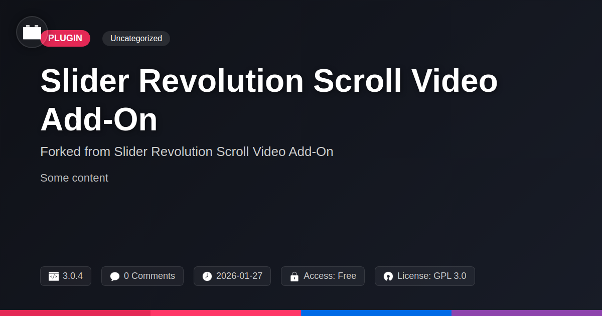 GrootMade is NOT affiliated with Slider Revolution Scroll Video Add-On or its original author. Slider Revolution Scroll Video Add-On™ is a trademark of its respective owner and use of it does not imply any endorsement or affiliation. This product has been forked under the GNU General Public License (GPL) and all non-GPL assets (such as proprietary images, fonts, and branding) have been removed. Distributing GPL-licensed code is 100% legal.