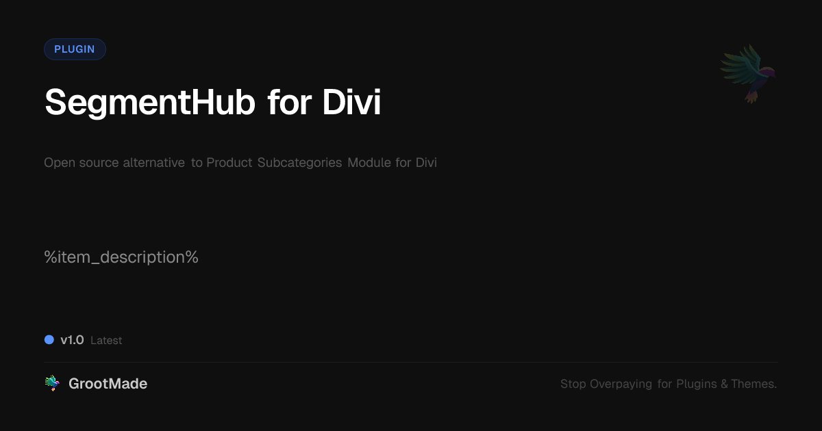 GrootMade is NOT affiliated with Product Subcategories Module for Divi or its original author. Product Subcategories Module for Divi™ is a trademark of its respective owner and use of it does not imply any endorsement or affiliation. This product has been forked under the GNU General Public License (GPL) and all non-GPL assets (such as proprietary images, fonts, and branding) have been removed. Distributing GPL-licensed code is 100% legal.