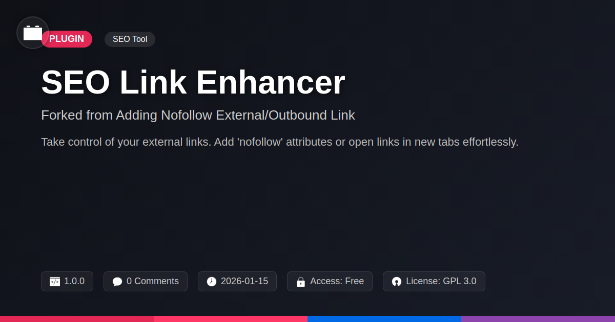 GrootMade is NOT affiliated with Adding Nofollow External/Outbound Link or its original author. Adding Nofollow External/Outbound Link™ is a trademark of its respective owner and use of it does not imply any endorsement or affiliation. This product has been forked under the GNU General Public License (GPL) and all non-GPL assets (such as proprietary images, fonts, and branding) have been removed. Distributing GPL-licensed code is 100% legal.