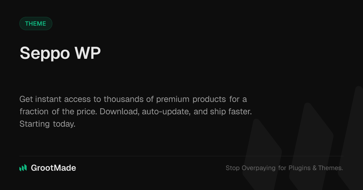 GrootMade is NOT affiliated with Seppo WP or its original author. Seppo WP™ is a trademark of its respective owner and use of it does not imply any endorsement or affiliation. This product has been forked under the GNU General Public License (GPL) and all non-GPL assets (such as proprietary images, fonts, and branding) have been removed. Distributing GPL-licensed code is 100% legal.