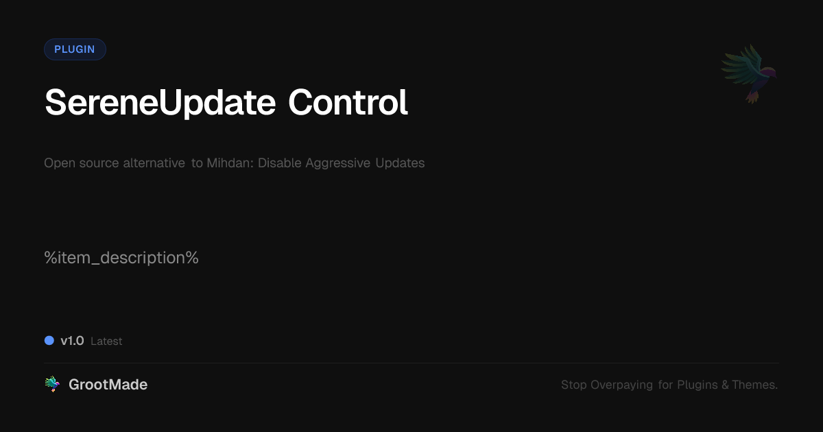 GrootMade is NOT affiliated with Mihdan: Disable Aggressive Updates or its original author. Mihdan: Disable Aggressive Updates™ is a trademark of its respective owner and use of it does not imply any endorsement or affiliation. This product has been forked under the GNU General Public License (GPL) and all non-GPL assets (such as proprietary images, fonts, and branding) have been removed. Distributing GPL-licensed code is 100% legal.