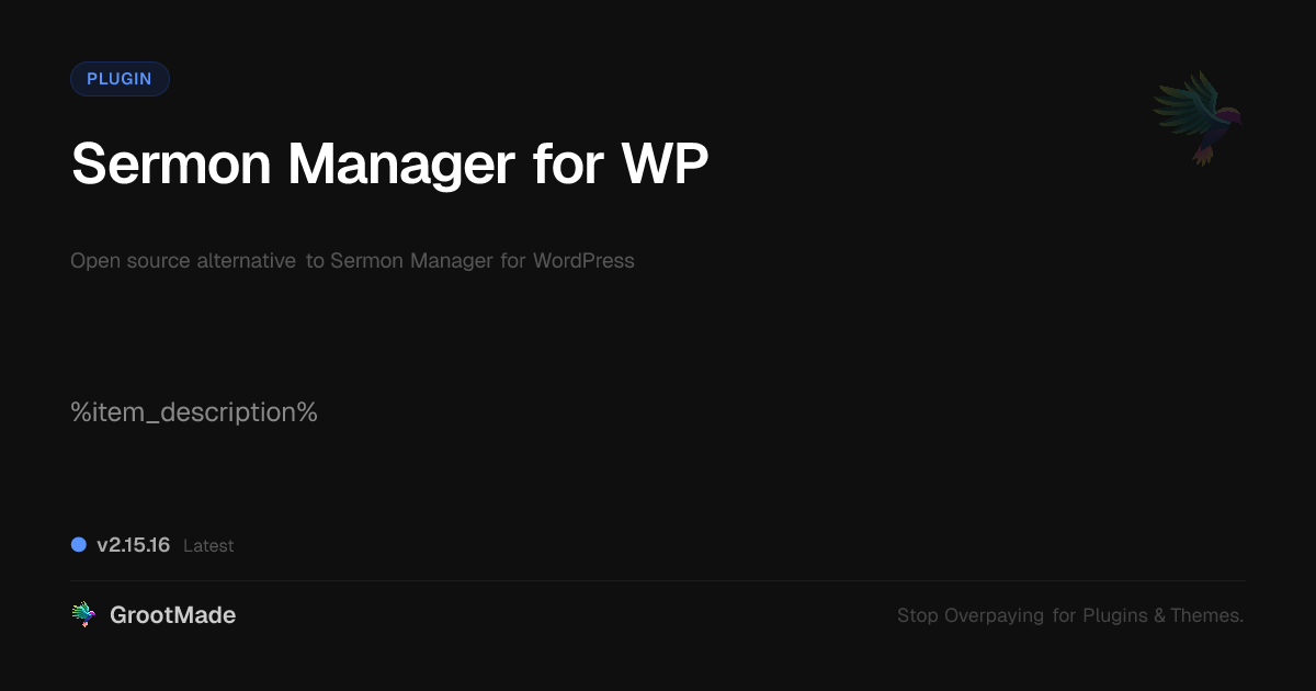 GrootMade is NOT affiliated with Sermon Manager for WordPress or its original author. Sermon Manager for WordPress™ is a trademark of its respective owner and use of it does not imply any endorsement or affiliation. This product has been forked under the GNU General Public License (GPL) and all non-GPL assets (such as proprietary images, fonts, and branding) have been removed. Distributing GPL-licensed code is 100% legal.