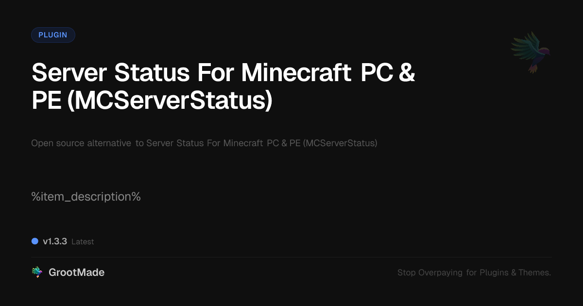 GrootMade is NOT affiliated with Server Status For Minecraft PC & PE (MCServerStatus) or its original author. Server Status For Minecraft PC & PE (MCServerStatus)™ is a trademark of its respective owner and use of it does not imply any endorsement or affiliation. This product has been forked under the GNU General Public License (GPL) and all non-GPL assets (such as proprietary images, fonts, and branding) have been removed. Distributing GPL-licensed code is 100% legal.