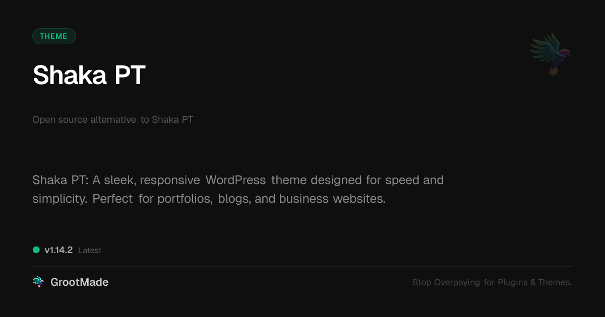 GrootMade is NOT affiliated with Shaka PT or its original author. Shaka PT™ is a trademark of its respective owner and use of it does not imply any endorsement or affiliation. This product has been forked under the GNU General Public License (GPL) and all non-GPL assets (such as proprietary images, fonts, and branding) have been removed. Distributing GPL-licensed code is 100% legal.