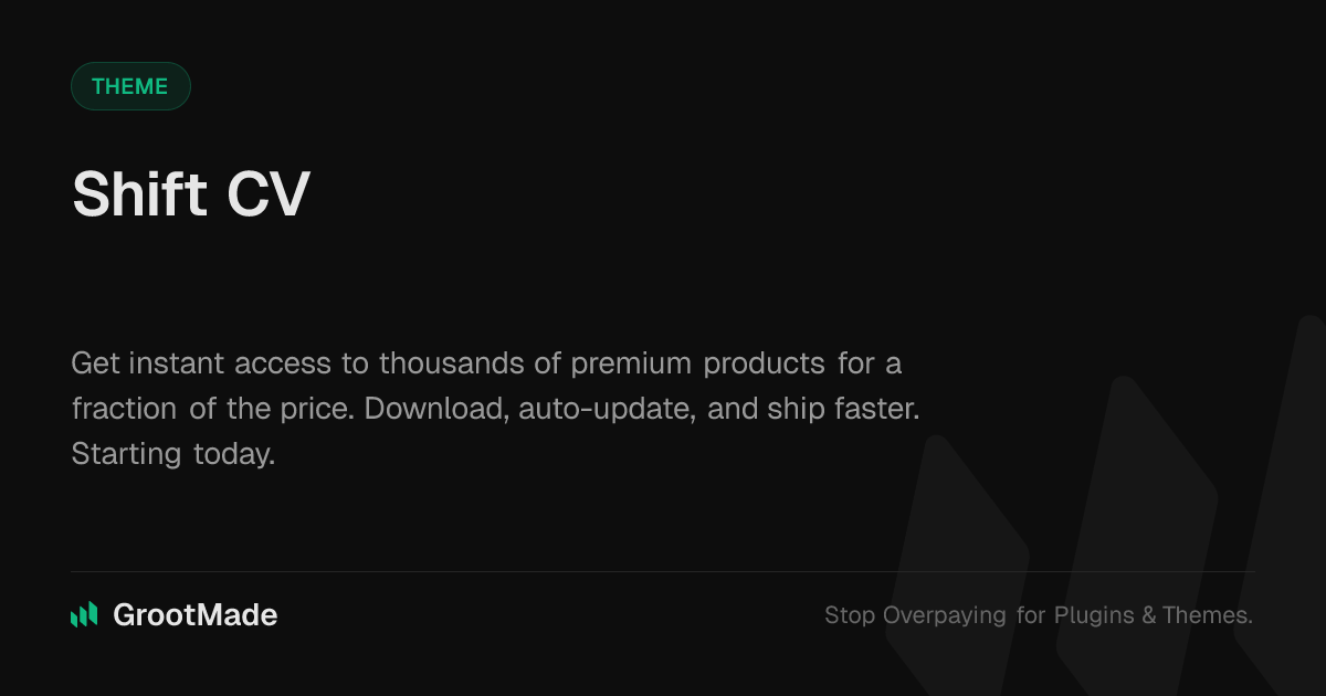 GrootMade is NOT affiliated with Shift CV or its original author. Shift CV™ is a trademark of its respective owner and use of it does not imply any endorsement or affiliation. This product has been forked under the GNU General Public License (GPL) and all non-GPL assets (such as proprietary images, fonts, and branding) have been removed. Distributing GPL-licensed code is 100% legal.