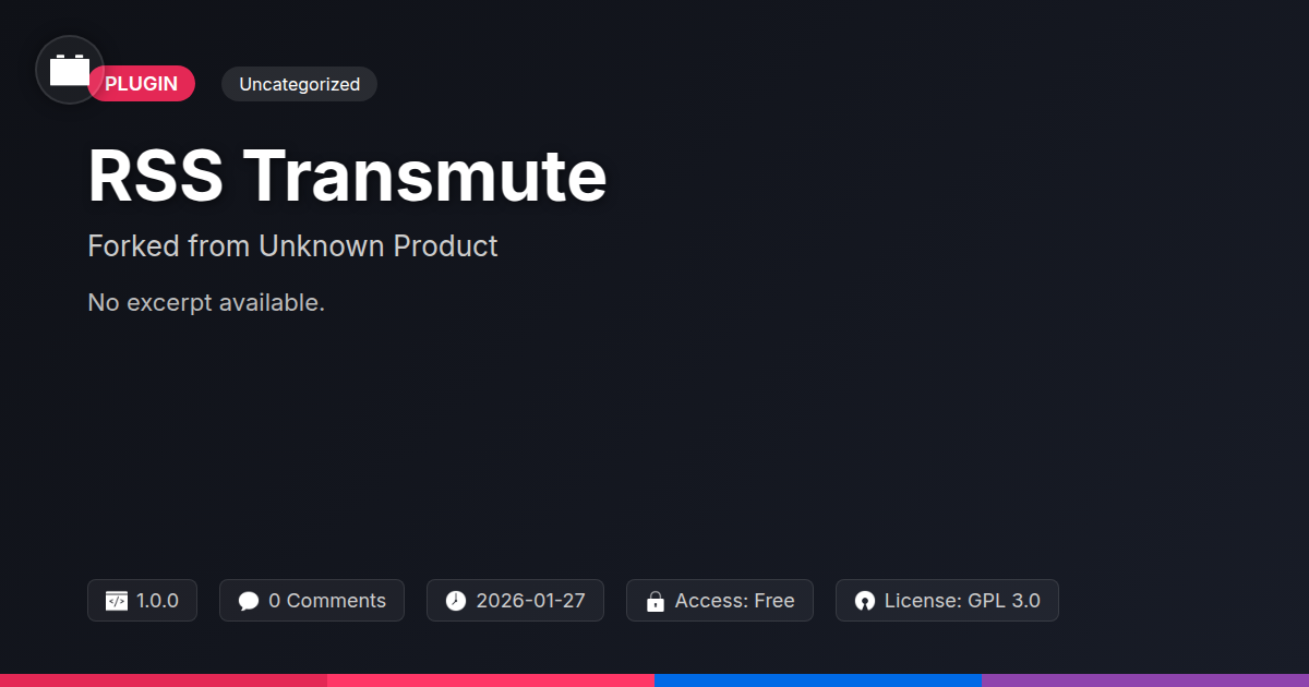 GrootMade is NOT affiliated with RSS Transmute - Feed Editor and Republisher or its original author. RSS Transmute - Feed Editor and Republisher™ is a trademark of its respective owner and use of it does not imply any endorsement or affiliation. This product has been forked under the GNU General Public License (GPL) and all non-GPL assets (such as proprietary images, fonts, and branding) have been removed. Distributing GPL-licensed code is 100% legal.