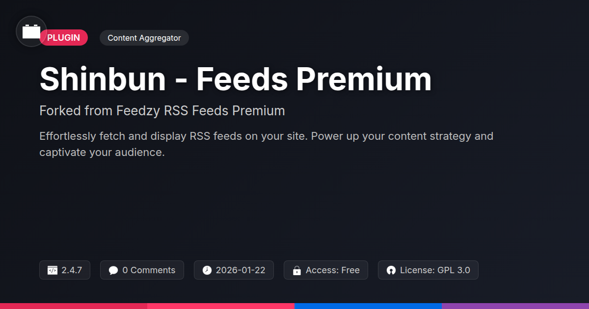 So, are you still copy-pasting like it’s 2005? Or are you ready to join the ranks of the smart developers, savvy agencies, and open-source aficionados who’ve ditched the manual labor for elegant automation? Shinbun - Feeds Premium isn't just another plugin; it's a declaration of independence from the tyranny of tedious content updates. It’s the robust, flexible, and yes, downright fun way to bring the world’s content to your doorstep (or, well, your website). For developers, it’s a canvas for creative control. For agencies, it’s a productivity superpower. And for open-source lovers, it’s a testament to the power of transparency and community. Stop letting your content strategy be a chore and start making it a strategic advantage. Get Shinbun - Feeds Premium, and watch your website become the dynamic, engaging hub it was always meant to be. It’s time to level up your content game. Your sanity, and your audience, will thank you.