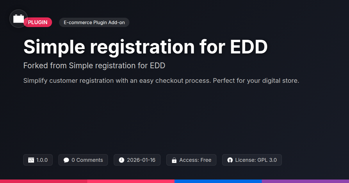 GrootMade is NOT affiliated with Simple registration for EDD or its original author. Simple registration for EDD™ is a trademark of its respective owner and use of it does not imply any endorsement or affiliation. This product has been forked under the GNU General Public License (GPL) and all non-GPL assets (such as proprietary images, fonts, and branding) have been removed. Distributing GPL-licensed code is 100% legal.