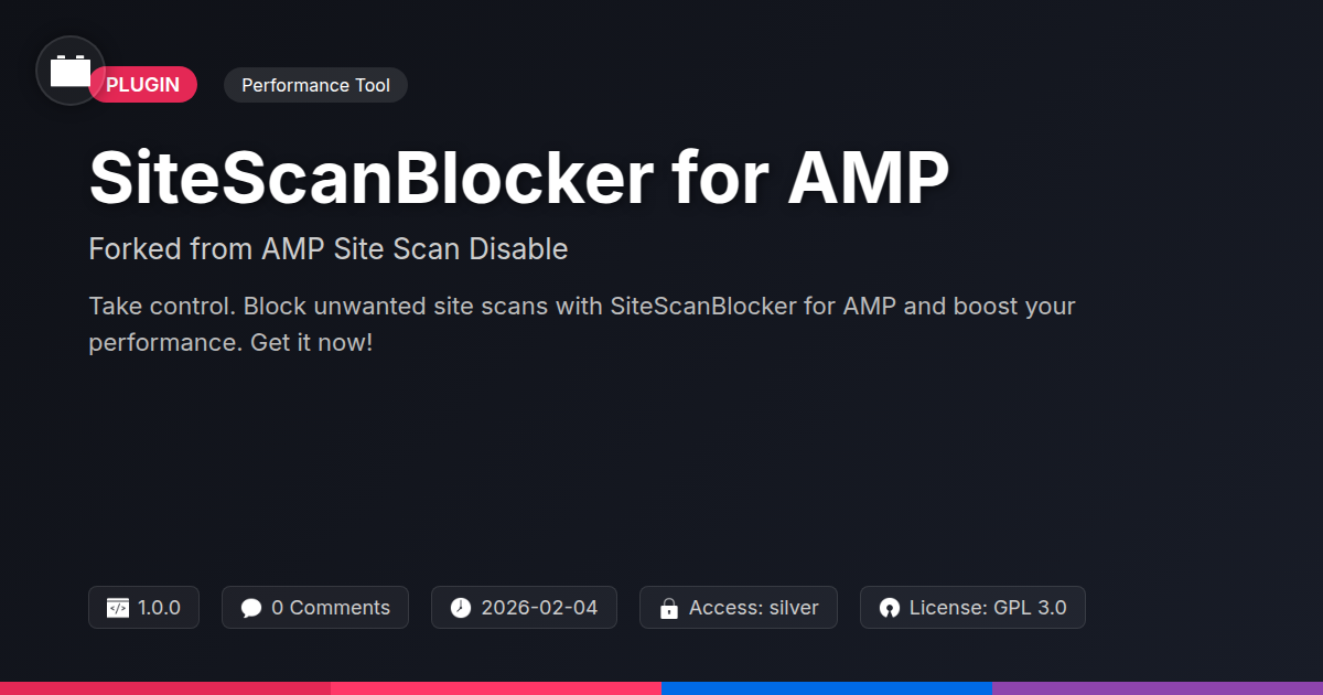 Tired of unexpected site slowdowns from scans? Meet SiteScanBlocker for AMP. This project is a collaborative effort, a fork built upon the solid foundation established by its original developers. We honor their contributions to the open-source community. SiteScanBlocker for AMP puts you back in charge. You decide when and how scans interact with your site. It’s your website. It’s your control. Think of it as a polite but firm bouncer for your site’s performance. It stands guard, ensuring scans are only allowed when and how you see fit. This tool is designed for developers, agencies, and open-source fans. If you value your site’s speed and server resources, this is for you. Regain effortless command over your digital space. It’s simple, yet remarkably powerful. Your site’s performance deserves a smart protector.