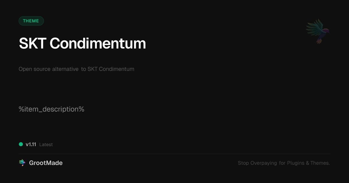 GrootMade is NOT affiliated with SKT Condimentum or its original author. SKT Condimentum™ is a trademark of its respective owner and use of it does not imply any endorsement or affiliation. This product has been forked under the GNU General Public License (GPL) and all non-GPL assets (such as proprietary images, fonts, and branding) have been removed. Distributing GPL-licensed code is 100% legal.