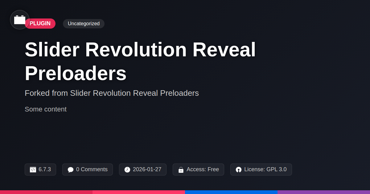 GrootMade is NOT affiliated with Slider Revolution Reveal Preloaders or its original author. Slider Revolution Reveal Preloaders™ is a trademark of its respective owner and use of it does not imply any endorsement or affiliation. This product has been forked under the GNU General Public License (GPL) and all non-GPL assets (such as proprietary images, fonts, and branding) have been removed. Distributing GPL-licensed code is 100% legal.