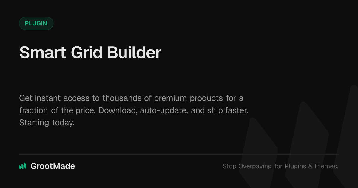 GrootMade is NOT affiliated with Smart Grid Builder or its original author. Smart Grid Builder™ is a trademark of its respective owner and use of it does not imply any endorsement or affiliation. This product has been forked under the GNU General Public License (GPL) and all non-GPL assets (such as proprietary images, fonts, and branding) have been removed. Distributing GPL-licensed code is 100% legal.