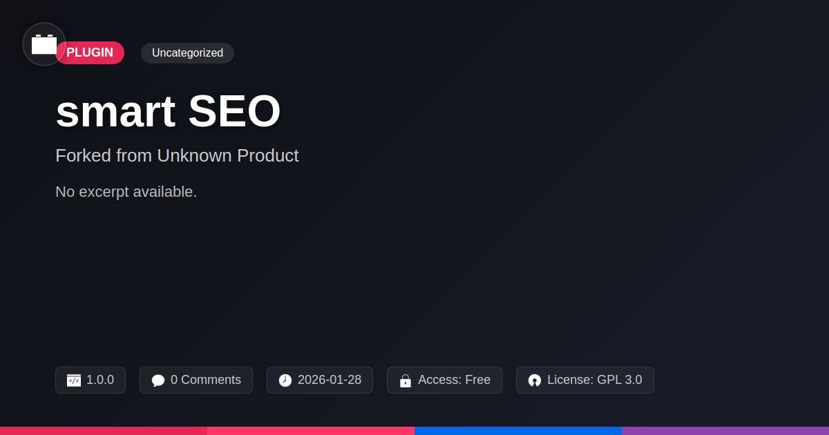 GrootMade is NOT affiliated with smart SEO - Wordpress plugin or its original author. smart SEO - Wordpress plugin™ is a trademark of its respective owner and use of it does not imply any endorsement or affiliation. This product has been forked under the GNU General Public License (GPL) and all non-GPL assets (such as proprietary images, fonts, and branding) have been removed. Distributing GPL-licensed code is 100% legal.