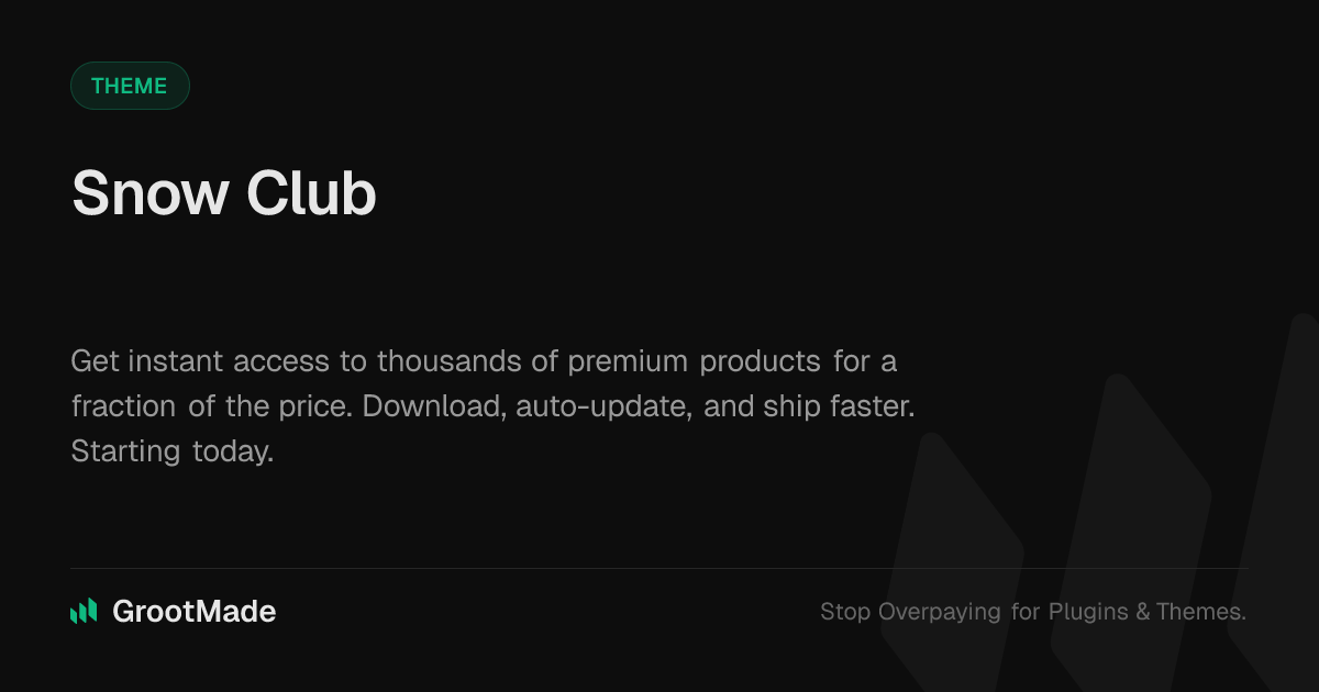 GrootMade is NOT affiliated with Snow Club or its original author. Snow Club™ is a trademark of its respective owner and use of it does not imply any endorsement or affiliation. This product has been forked under the GNU General Public License (GPL) and all non-GPL assets (such as proprietary images, fonts, and branding) have been removed. Distributing GPL-licensed code is 100% legal.