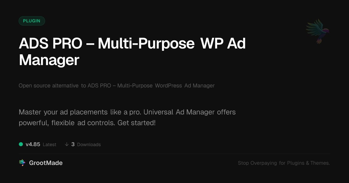 GrootMade is NOT affiliated with ADS PRO – Multi-Purpose WordPress Ad Manager or its original author. ADS PRO – Multi-Purpose WordPress Ad Manager™ is a trademark of its respective owner and use of it does not imply any endorsement or affiliation. This product has been forked under the GNU General Public License (GPL) and all non-GPL assets (such as proprietary images, fonts, and branding) have been removed. Distributing GPL-licensed code is 100% legal.