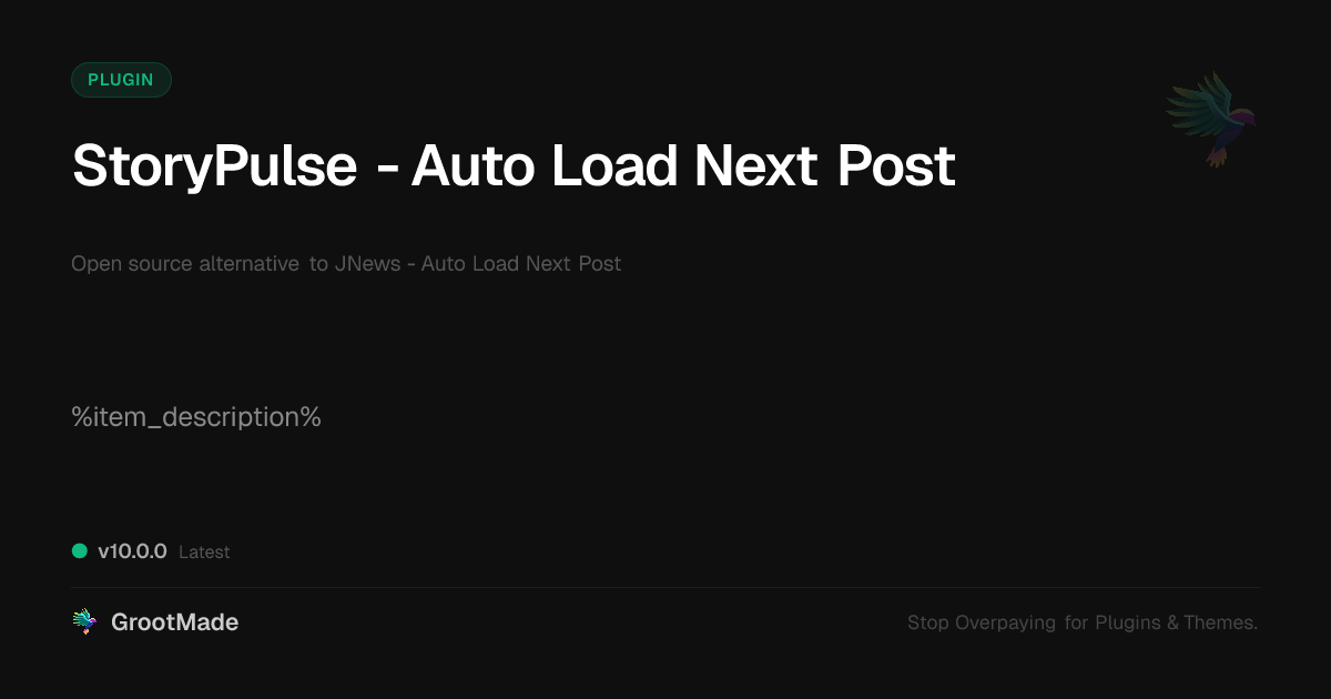 GrootMade is NOT affiliated with JNews - Auto Load Next Post or its original author. JNews - Auto Load Next Post™ is a trademark of its respective owner and use of it does not imply any endorsement or affiliation. This product has been forked under the GNU General Public License (GPL) and all non-GPL assets (such as proprietary images, fonts, and branding) have been removed. Distributing GPL-licensed code is 100% legal.
