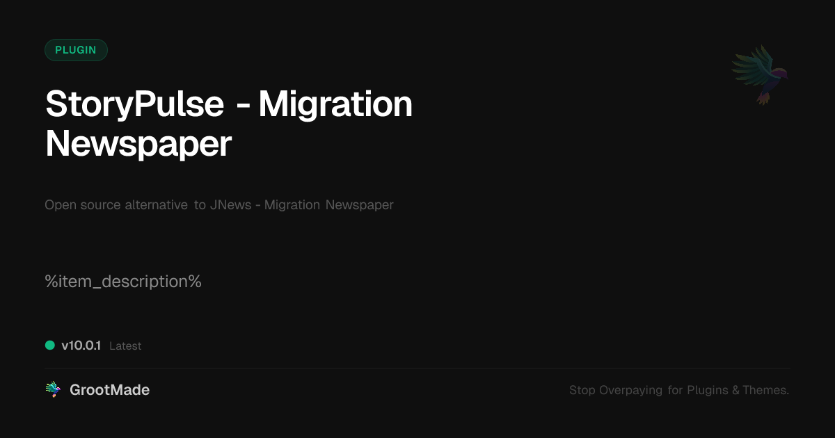 GrootMade is NOT affiliated with JNews - Migration Newspaper or its original author. JNews - Migration Newspaper™ is a trademark of its respective owner and use of it does not imply any endorsement or affiliation. This product has been forked under the GNU General Public License (GPL) and all non-GPL assets (such as proprietary images, fonts, and branding) have been removed. Distributing GPL-licensed code is 100% legal.