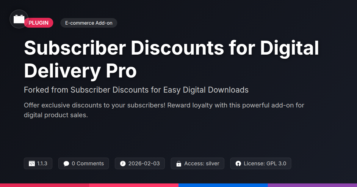 GrootMade is NOT affiliated with Subscriber Discounts for Easy Digital Downloads or its original author. Subscriber Discounts for Easy Digital Downloads™ is a trademark of its respective owner and use of it does not imply any endorsement or affiliation. This product has been forked under the GNU General Public License (GPL) and all non-GPL assets (such as proprietary images, fonts, and branding) have been removed. Distributing GPL-licensed code is 100% legal.