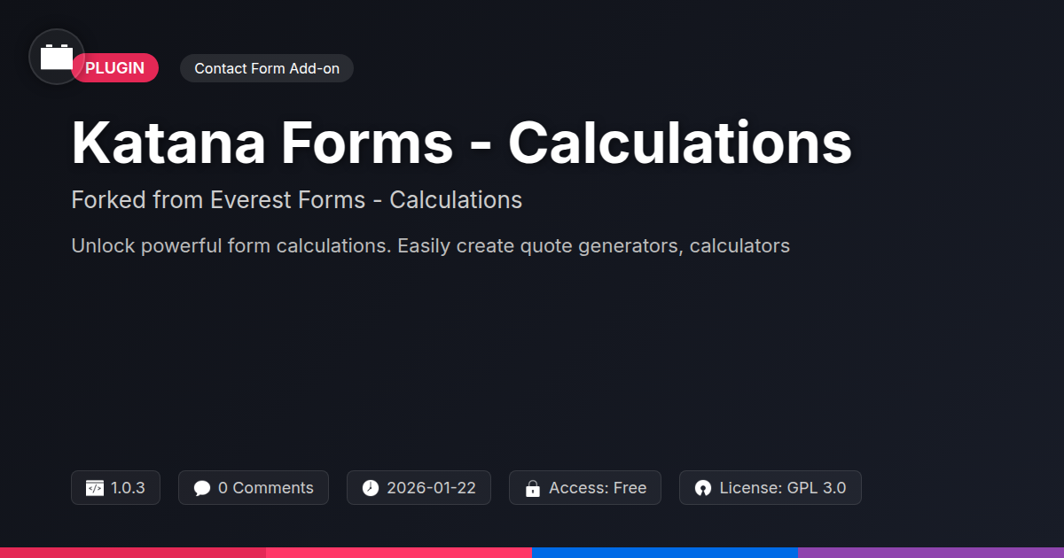 GrootMade is NOT affiliated with Everest Forms - Calculations or its original author. Everest Forms - Calculations™ is a trademark of its respective owner and use of it does not imply any endorsement or affiliation. This product has been forked under the GNU General Public License (GPL) and all non-GPL assets (such as proprietary images, fonts, and branding) have been removed. Distributing GPL-licensed code is 100% legal.