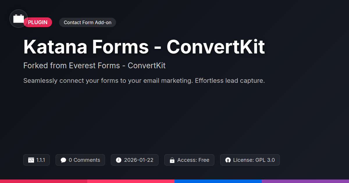 GrootMade is NOT affiliated with Everest Forms - ConvertKit or its original author. Everest Forms - ConvertKit™ is a trademark of its respective owner and use of it does not imply any endorsement or affiliation. This product has been forked under the GNU General Public License (GPL) and all non-GPL assets (such as proprietary images, fonts, and branding) have been removed. Distributing GPL-licensed code is 100% legal.