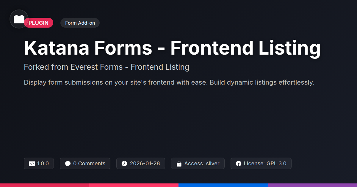 GrootMade is NOT affiliated with Everest Forms - Frontend Listing or its original author. Everest Forms - Frontend Listing™ is a trademark of its respective owner and use of it does not imply any endorsement or affiliation. This product has been forked under the GNU General Public License (GPL) and all non-GPL assets (such as proprietary images, fonts, and branding) have been removed. Distributing GPL-licensed code is 100% legal.