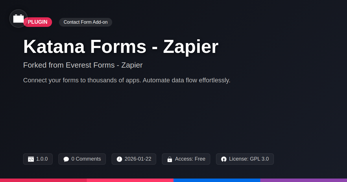 GrootMade is NOT affiliated with Everest Forms - Zapier or its original author. Everest Forms - Zapier™ is a trademark of its respective owner and use of it does not imply any endorsement or affiliation. This product has been forked under the GNU General Public License (GPL) and all non-GPL assets (such as proprietary images, fonts, and branding) have been removed. Distributing GPL-licensed code is 100% legal.