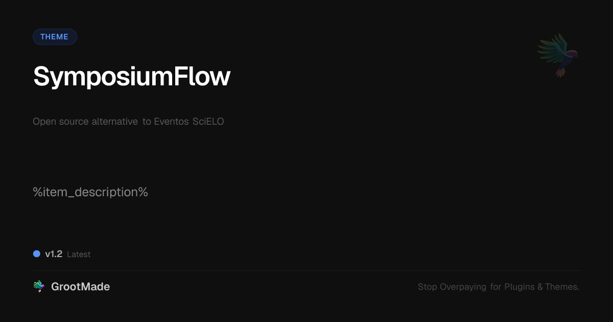 GrootMade is NOT affiliated with Eventos SciELO or its original author. Eventos SciELO™ is a trademark of its respective owner and use of it does not imply any endorsement or affiliation. This product has been forked under the GNU General Public License (GPL) and all non-GPL assets (such as proprietary images, fonts, and branding) have been removed. Distributing GPL-licensed code is 100% legal.
