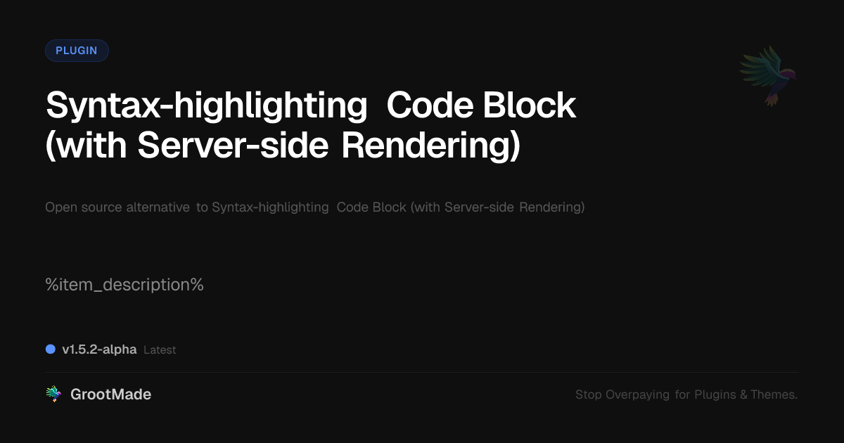 GrootMade is NOT affiliated with Syntax-highlighting Code Block (with Server-side Rendering) or its original author. Syntax-highlighting Code Block (with Server-side Rendering)™ is a trademark of its respective owner and use of it does not imply any endorsement or affiliation. This product has been forked under the GNU General Public License (GPL) and all non-GPL assets (such as proprietary images, fonts, and branding) have been removed. Distributing GPL-licensed code is 100% legal.