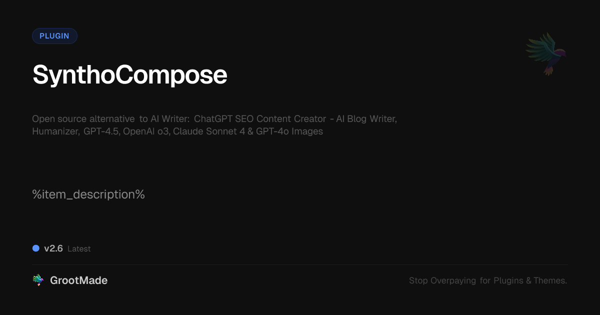 GrootMade is NOT affiliated with AI Writer: ChatGPT SEO Content Creator - AI Blog Writer, Humanizer, GPT-4.5, OpenAI o3, Claude Sonnet 4 & GPT-4o Images or its original author. AI Writer: ChatGPT SEO Content Creator - AI Blog Writer, Humanizer, GPT-4.5, OpenAI o3, Claude Sonnet 4 & GPT-4o Images™ is a trademark of its respective owner and use of it does not imply any endorsement or affiliation. This product has been forked under the GNU General Public License (GPL) and all non-GPL assets (such as proprietary images, fonts, and branding) have been removed. Distributing GPL-licensed code is 100% legal.