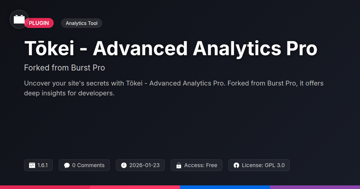 Alright, let's face it. Building amazing digital experiences is hard enough without having to play detective with your website's traffic. You pour your heart, soul, and probably way too much caffeine into every project, and the least you deserve is to know who is actually appreciating your hard work – and why. Guessing your way to success is about as effective as trying to teach a cat to play the piano (though arguably, some cats are more musically inclined than some analytics dashboards). Tōkei - Advanced Analytics Pro, born from the solid foundations of Burst Pro and infused with a healthy dose of developer-centric innovation, is here to change that. We've stripped away the fluff and focused on what truly matters: giving you clear, actionable insights that empower you to make smarter decisions. Whether you're a solo developer tweaking your personal project or an agency wrangling multiple client sites, our tool is designed to be your digital confidant. It's the analytics solution that understands your workflows, respects your time, and likely shares your opinion about poorly formatted code. So, ditch the guesswork, banish the data confusion, and say hello to a smarter way to understand your audience. It’s time to see your website's true potential, unclouded by corporate jargon and unnecessarily complex interfaces. Let Tōkei - Advanced Analytics Pro guide you, and get back to doing what you do best: building the web, one brilliant project at a time.