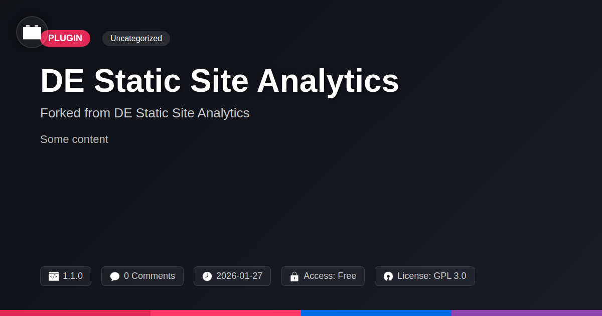 GrootMade is NOT affiliated with DE Static Site Analytics or its original author. DE Static Site Analytics™ is a trademark of its respective owner and use of it does not imply any endorsement or affiliation. This product has been forked under the GNU General Public License (GPL) and all non-GPL assets (such as proprietary images, fonts, and branding) have been removed. Distributing GPL-licensed code is 100% legal.