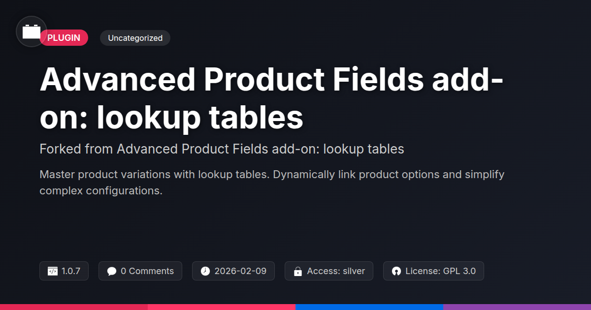 GrootMade is NOT affiliated with Advanced Product Fields add-on: lookup tables or its original author. Advanced Product Fields add-on: lookup tables™ is a trademark of its respective owner and use of it does not imply any endorsement or affiliation. This product has been forked under the GNU General Public License (GPL) and all non-GPL assets (such as proprietary images, fonts, and branding) have been removed. Distributing GPL-licensed code is 100% legal.