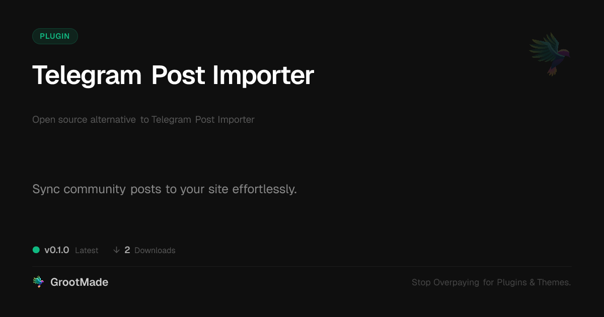 GrootMade is NOT affiliated with Telegram Post Importer or its original author. Telegram Post Importer™ is a trademark of its respective owner and use of it does not imply any endorsement or affiliation. This product has been forked under the GNU General Public License (GPL) and all non-GPL assets (such as proprietary images, fonts, and branding) have been removed. Distributing GPL-licensed code is 100% legal.