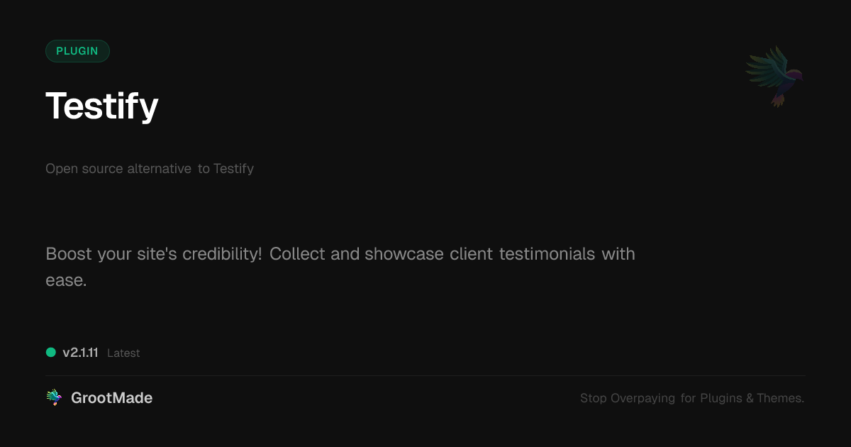 GrootMade is NOT affiliated with Testify or its original author. Testify™ is a trademark of its respective owner and use of it does not imply any endorsement or affiliation. This product has been forked under the GNU General Public License (GPL) and all non-GPL assets (such as proprietary images, fonts, and branding) have been removed. Distributing GPL-licensed code is 100% legal.
