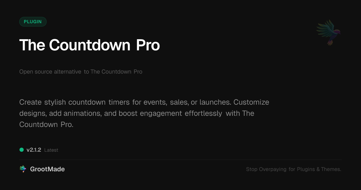 GrootMade is NOT affiliated with The Countdown Pro or its original author. The Countdown Pro™ is a trademark of its respective owner and use of it does not imply any endorsement or affiliation. This product has been forked under the GNU General Public License (GPL) and all non-GPL assets (such as proprietary images, fonts, and branding) have been removed. Distributing GPL-licensed code is 100% legal.