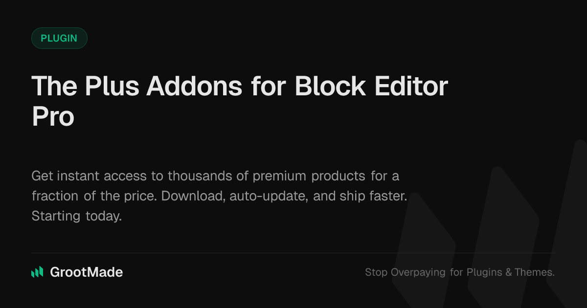GrootMade is NOT affiliated with The Plus Addons for Block Editor Pro or its original author. The Plus Addons for Block Editor Pro™ is a trademark of its respective owner and use of it does not imply any endorsement or affiliation. This product has been forked under the GNU General Public License (GPL) and all non-GPL assets (such as proprietary images, fonts, and branding) have been removed. Distributing GPL-licensed code is 100% legal.