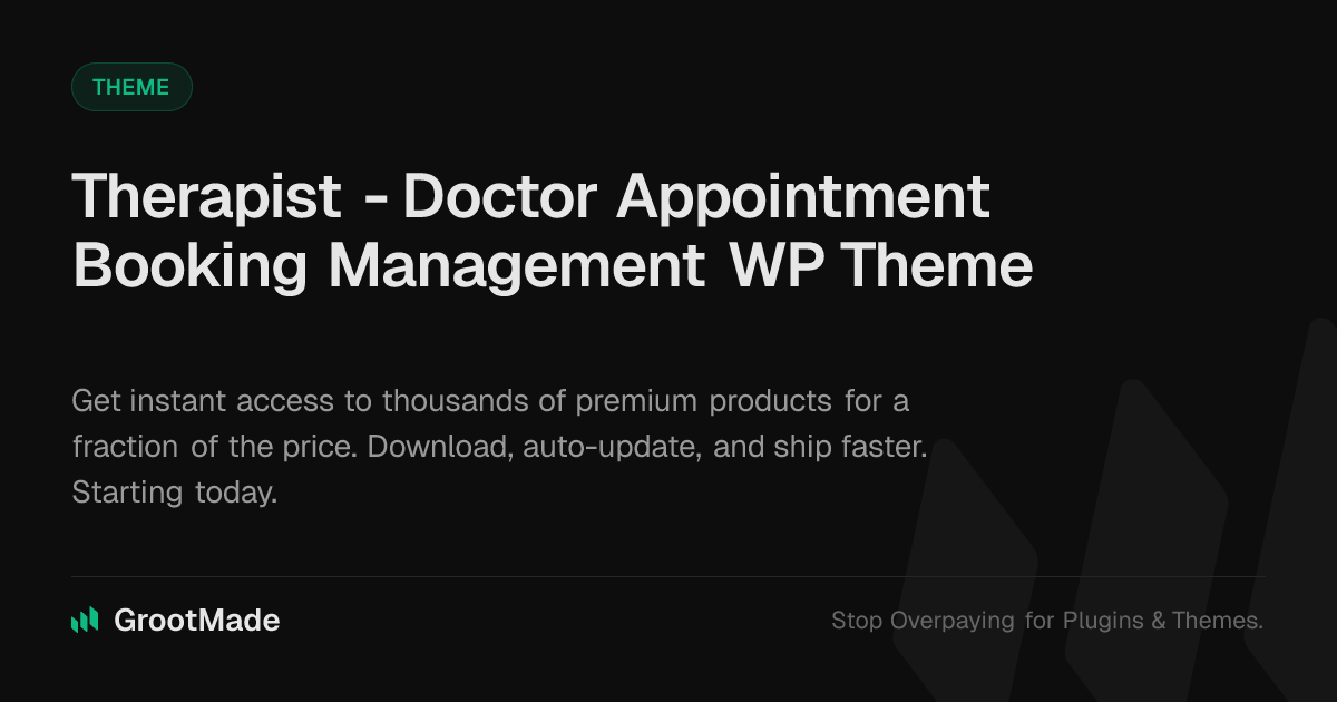 GrootMade is NOT affiliated with Therapist - Doctor Appointment Booking Management WordPress Theme or its original author. Therapist - Doctor Appointment Booking Management WordPress Theme™ is a trademark of its respective owner and use of it does not imply any endorsement or affiliation. This product has been forked under the GNU General Public License (GPL) and all non-GPL assets (such as proprietary images, fonts, and branding) have been removed. Distributing GPL-licensed code is 100% legal.