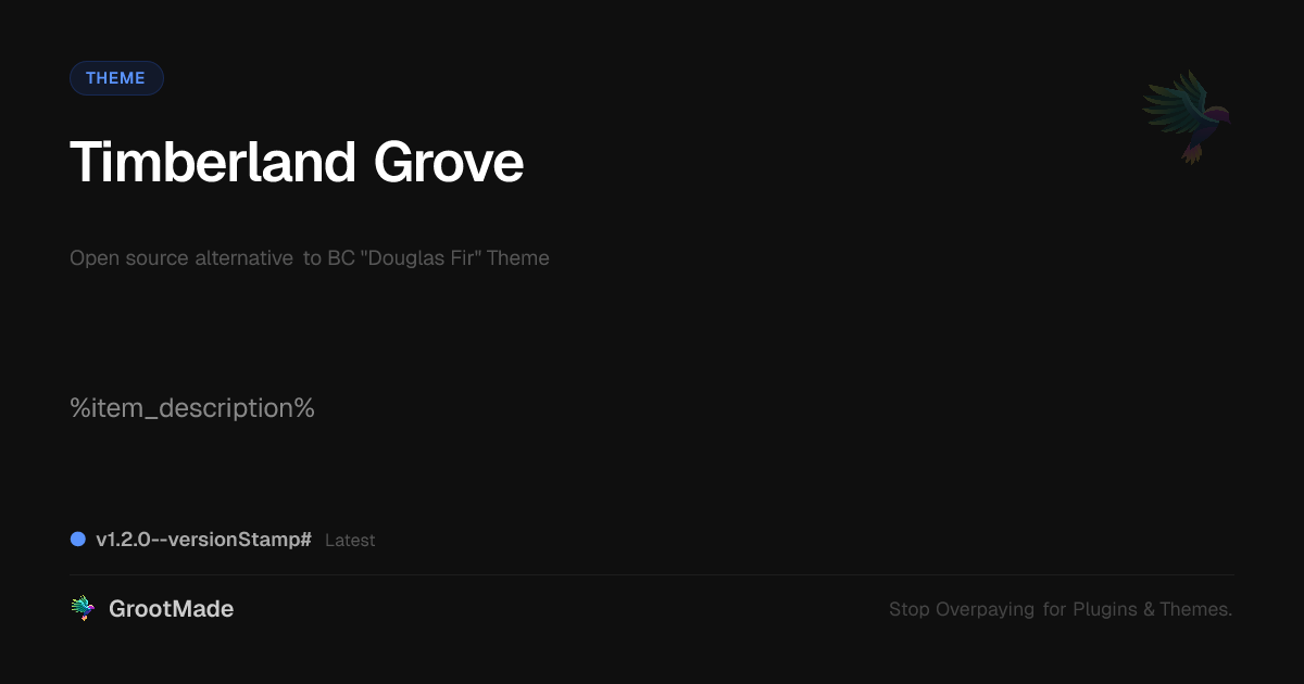 GrootMade is NOT affiliated with BC "Douglas Fir" Theme or its original author. BC "Douglas Fir" Theme™ is a trademark of its respective owner and use of it does not imply any endorsement or affiliation. This product has been forked under the GNU General Public License (GPL) and all non-GPL assets (such as proprietary images, fonts, and branding) have been removed. Distributing GPL-licensed code is 100% legal.
