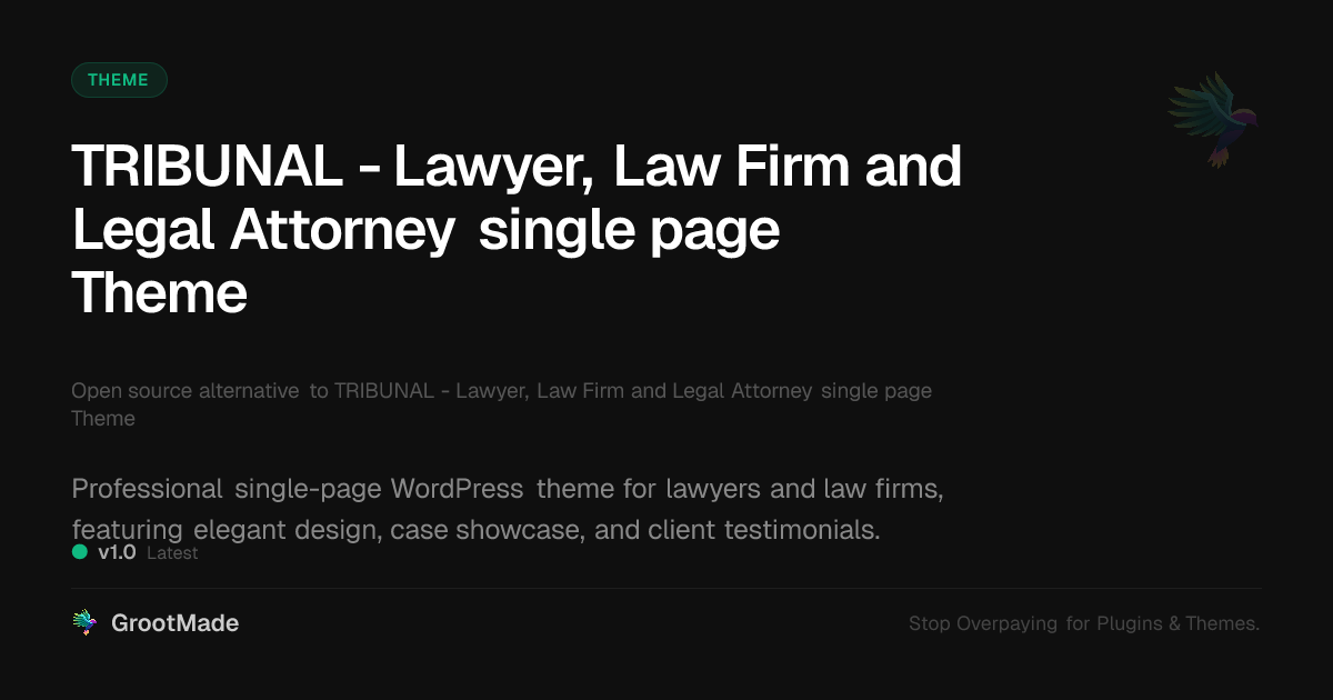 GrootMade is NOT affiliated with TRIBUNAL - Lawyer, Law Firm and Legal Attorney single page Theme or its original author. TRIBUNAL - Lawyer, Law Firm and Legal Attorney single page Theme™ is a trademark of its respective owner and use of it does not imply any endorsement or affiliation. This product has been forked under the GNU General Public License (GPL) and all non-GPL assets (such as proprietary images, fonts, and branding) have been removed. Distributing GPL-licensed code is 100% legal.