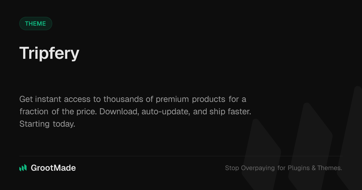 GrootMade is NOT affiliated with Tripfery or its original author. Tripfery™ is a trademark of its respective owner and use of it does not imply any endorsement or affiliation. This product has been forked under the GNU General Public License (GPL) and all non-GPL assets (such as proprietary images, fonts, and branding) have been removed. Distributing GPL-licensed code is 100% legal.