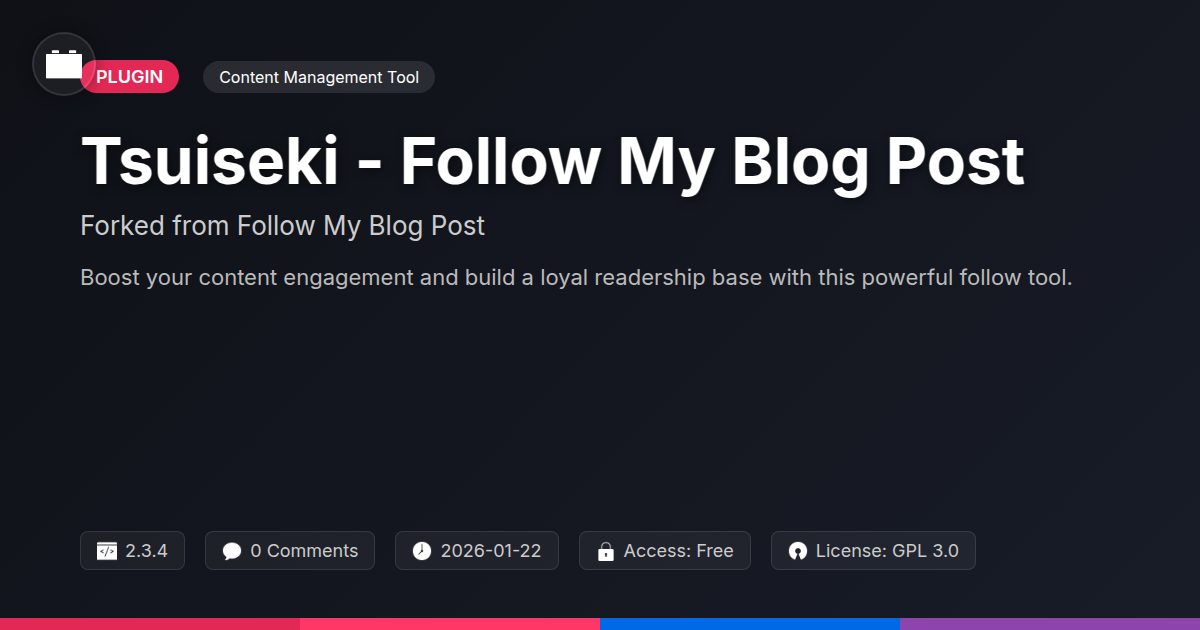 GrootMade is NOT affiliated with Follow My Blog Post or its original author. Follow My Blog Post™ is a trademark of its respective owner and use of it does not imply any endorsement or affiliation. This product has been forked under the GNU General Public License (GPL) and all non-GPL assets (such as proprietary images, fonts, and branding) have been removed. Distributing GPL-licensed code is 100% legal.