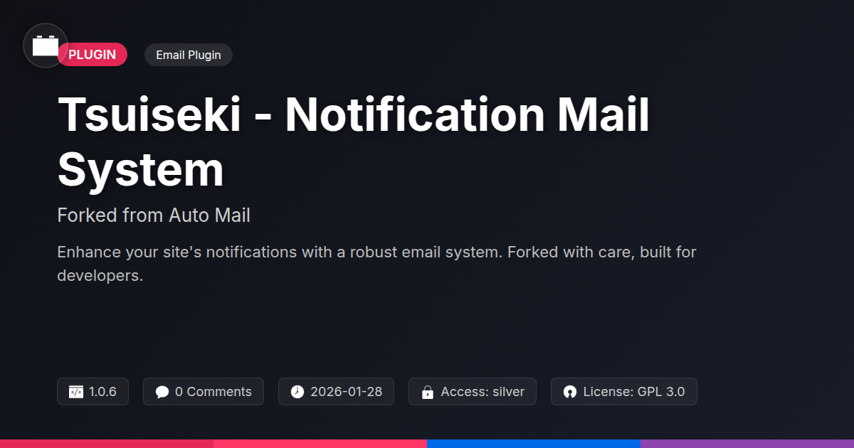 Ever felt like your site's communication is stuck in a digital dark age, sending emails that look like they were typed on a rotary phone? Are you tired of your site just… shrugging when important stuff happens, like a new lead signing up or a customer actually buying something? If you've ever found yourself wishing your website could just talk to you (and your clients) in a more sophisticated, automated way, then you're in the right place. We get it. Managing notifications can feel like herding digital cats, especially when you're juggling multiple client projects or trying to keep your own open-source creation humming along. You're a developer, a builder, an agency owner, a tinkerer of the digital kind. You appreciate robust tools, elegant solutions, and maybe a good dose of sarcasm to get through the day. That's why we're thrilled to introduce Tsuiseki, a notification mail system forked from the legendary Auto Mail by Festinger Vault. Think of it as a souped-up, community-driven evolution, designed specifically for folks like you who demand more from their digital tools. It’s the notification system you wish you’d built yourself, but hey, we got there first. And the best part? It's open-source and ready to make your website actually useful. Forget those bland, generic alerts. Tsuiseki is here to ensure your site never drops the ball again, keeping everyone in the loop with style and efficiency. No more missed opportunities, no more 'oops, I forgot to tell them' moments. Just seamless, automated communication that works as hard as you do. Ready to elevate your site's conversation game?