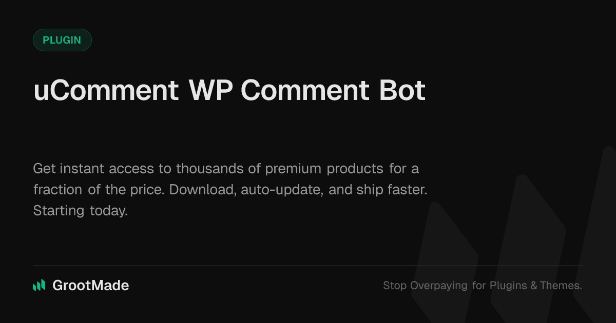 GrootMade is NOT affiliated with uComment WP Comment Bot or its original author. uComment WP Comment Bot™ is a trademark of its respective owner and use of it does not imply any endorsement or affiliation. This product has been forked under the GNU General Public License (GPL) and all non-GPL assets (such as proprietary images, fonts, and branding) have been removed. Distributing GPL-licensed code is 100% legal.
