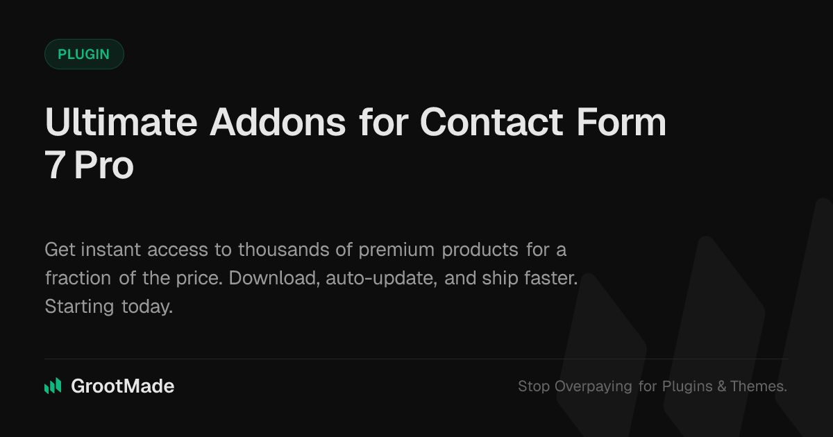 GrootMade is NOT affiliated with Ultimate Addons for Contact Form 7 Pro or its original author. Ultimate Addons for Contact Form 7 Pro™ is a trademark of its respective owner and use of it does not imply any endorsement or affiliation. This product has been forked under the GNU General Public License (GPL) and all non-GPL assets (such as proprietary images, fonts, and branding) have been removed. Distributing GPL-licensed code is 100% legal.