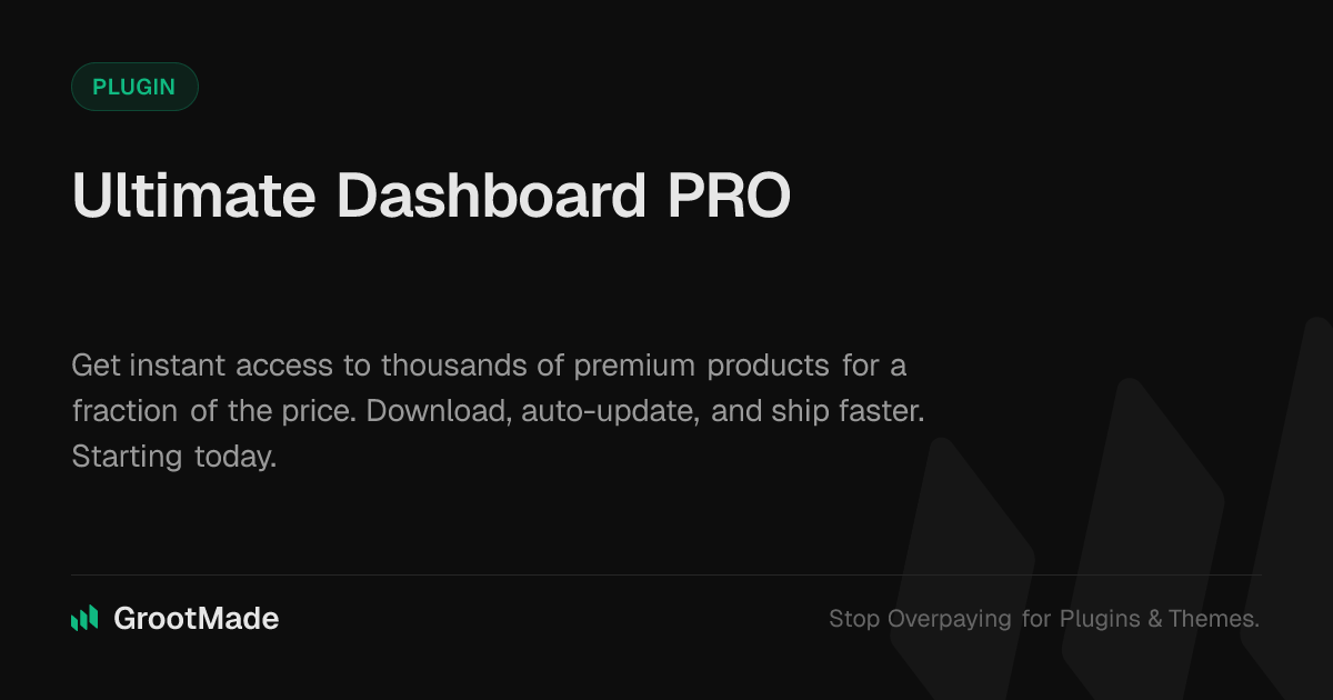 GrootMade is NOT affiliated with Ultimate Dashboard PRO or its original author. Ultimate Dashboard PRO™ is a trademark of its respective owner and use of it does not imply any endorsement or affiliation. This product has been forked under the GNU General Public License (GPL) and all non-GPL assets (such as proprietary images, fonts, and branding) have been removed. Distributing GPL-licensed code is 100% legal.